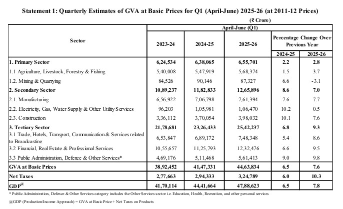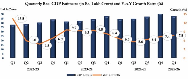 In the first quarter of the financial year 2025–26 (April to June 2025), the economy grew at a rate of 7.8%, compared to 6.5% in the previous quarter.
